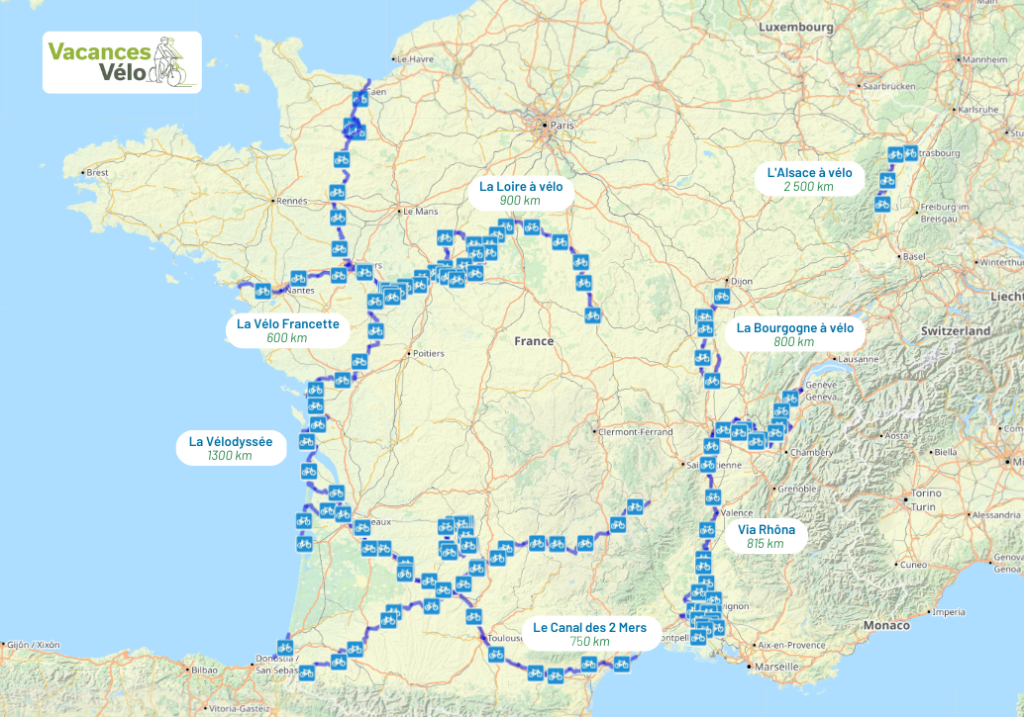 En France, vous pourrez pédaler le long de "La Vélodyssée" qui traverse la Bretagne et longe la côte atlantique ; "La Loire à vélo" à travers le Pays des Châteaux, le long de la Loire ; "La Vélo Francette" qui traverse la Normandie jusqu'à la côte Atlantique ; "La Via Rhôna" du lac Léman à la Méditerranée ; deux itinéraires cyclables au milieu des vignobles : "l'Alsace à vélo" et "La Bourgogne à vélo"... et bien d'autres véloroutes et voies vertes.